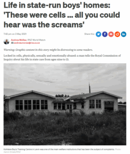 Kohitere Boys’ Training Centre in Taitoko Levin: Normalised and pervasive violence, with many experiencing severe corporal punishment, sometimes inflicted with weapons and to the genitals, staff encouraged peer-on-peer violence through a king-pin system, sexual abuse, misused solitary confinement, normalised racism and cultural abuse, boys punished with extreme physical training and inhumane tasks.