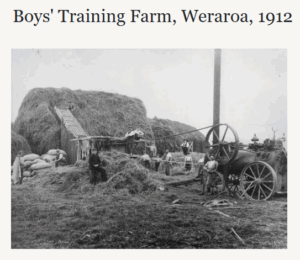 The Boys' Training Farm at Weraroa in Levin was a government institution for children opened in 1905. It housed boys with behavioural problems – identified as 'delinquents' – although neglected and orphaned boys also ended up there. Occupational training was an important element of the institution's regime. These boys are threshing hay in 1912.